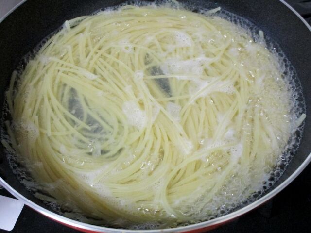 疲れてたし面倒だったからフライパンでパスタ茹でて
